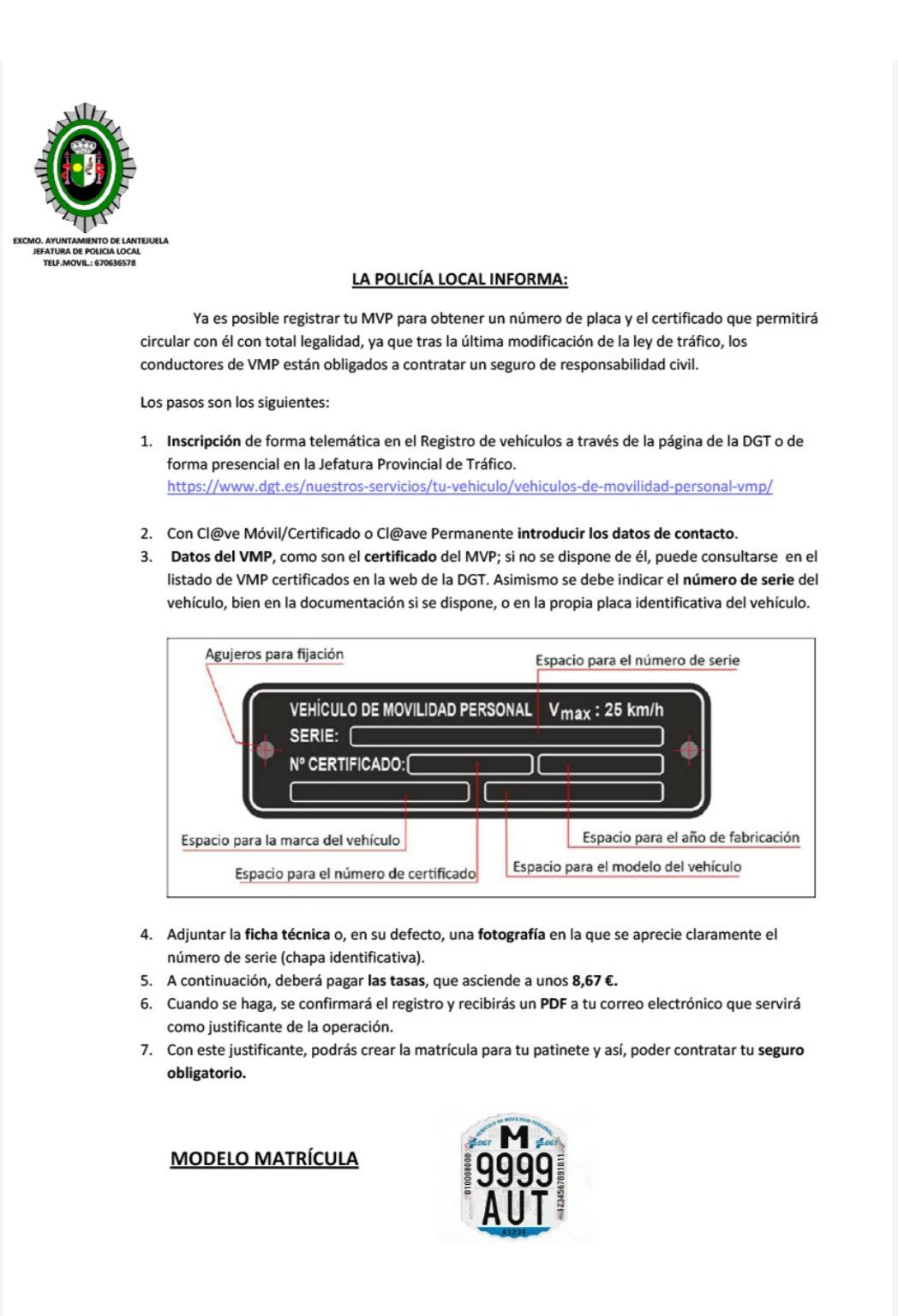 La Policía Local informa de que ya es posible registrar tu vehículo de movilidad personal (patinete eléctrico) para obtener un número de placa y circular con total legalidad.