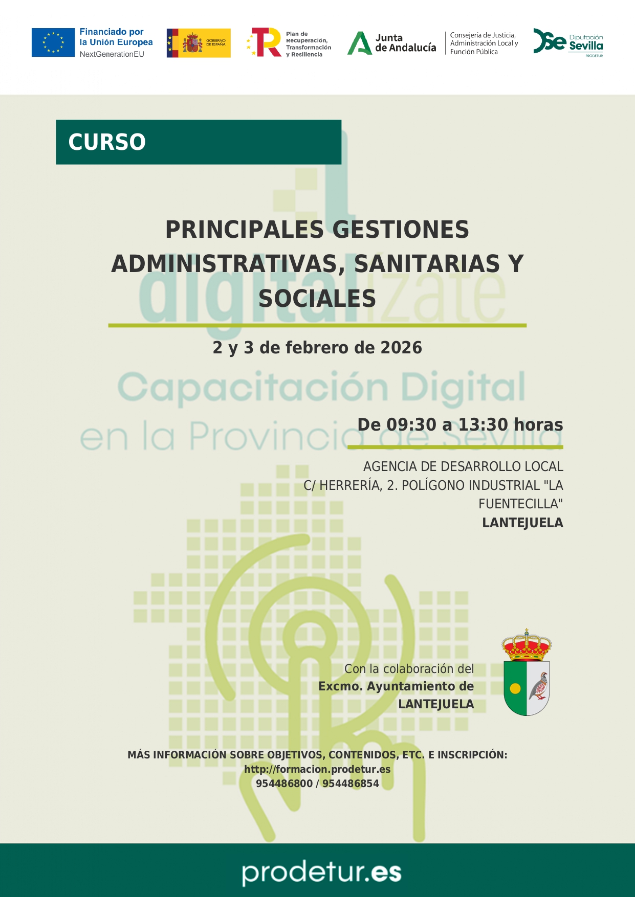 Los días 2 y 3 de febrero de 2026, Lantejuela acoge el curso “Principales gestiones administrativas, sanitarias y sociales”, orientado a facilitar el conocimiento y manejo de los trámites más habituales en estos ámbitos.