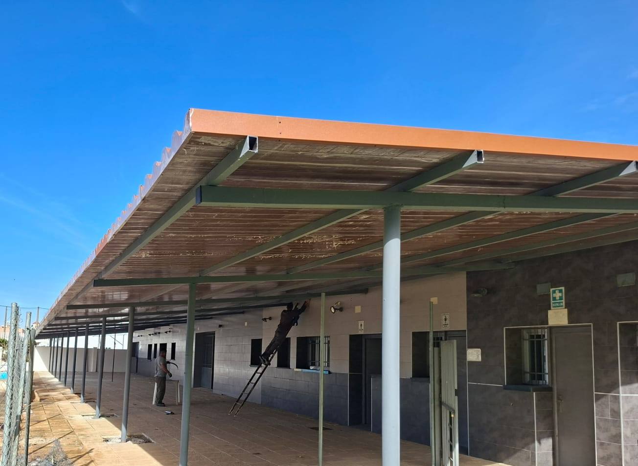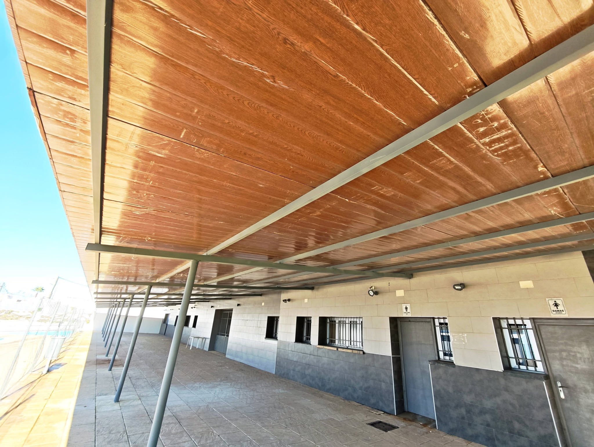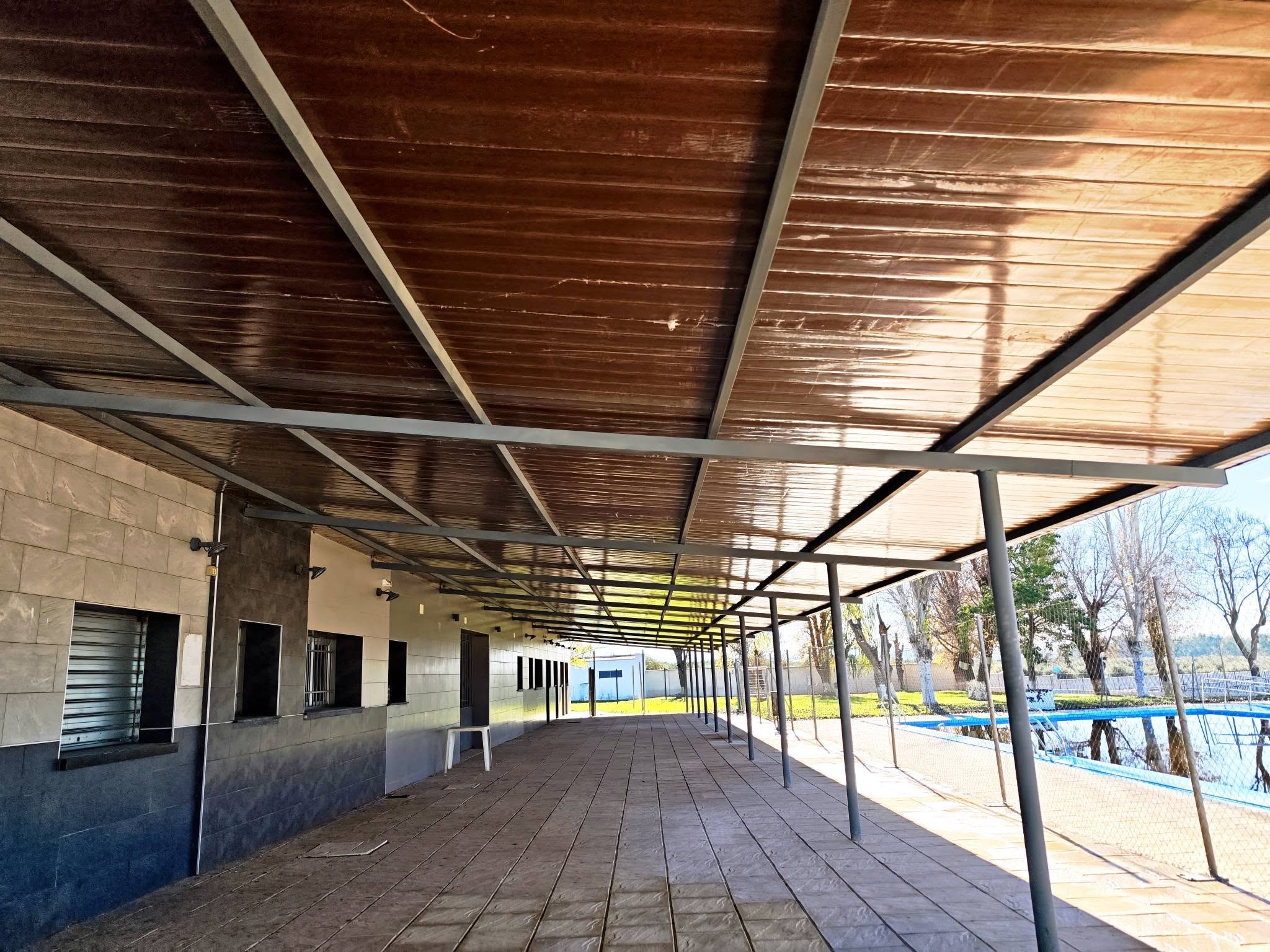 Finalizado el trabajo de reposición del techo sándwich para pérgola en la zona de vestuarios, servicios y terraza del bar de la piscina municipal.