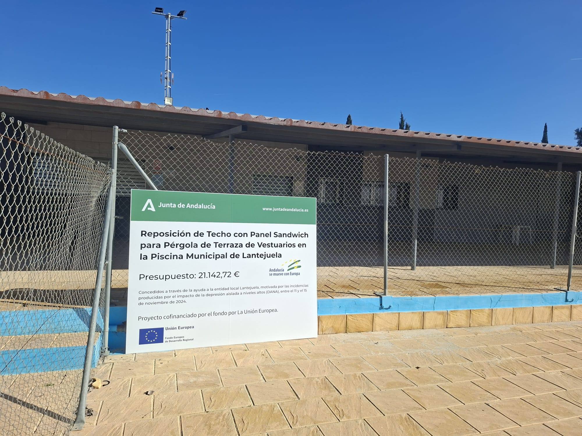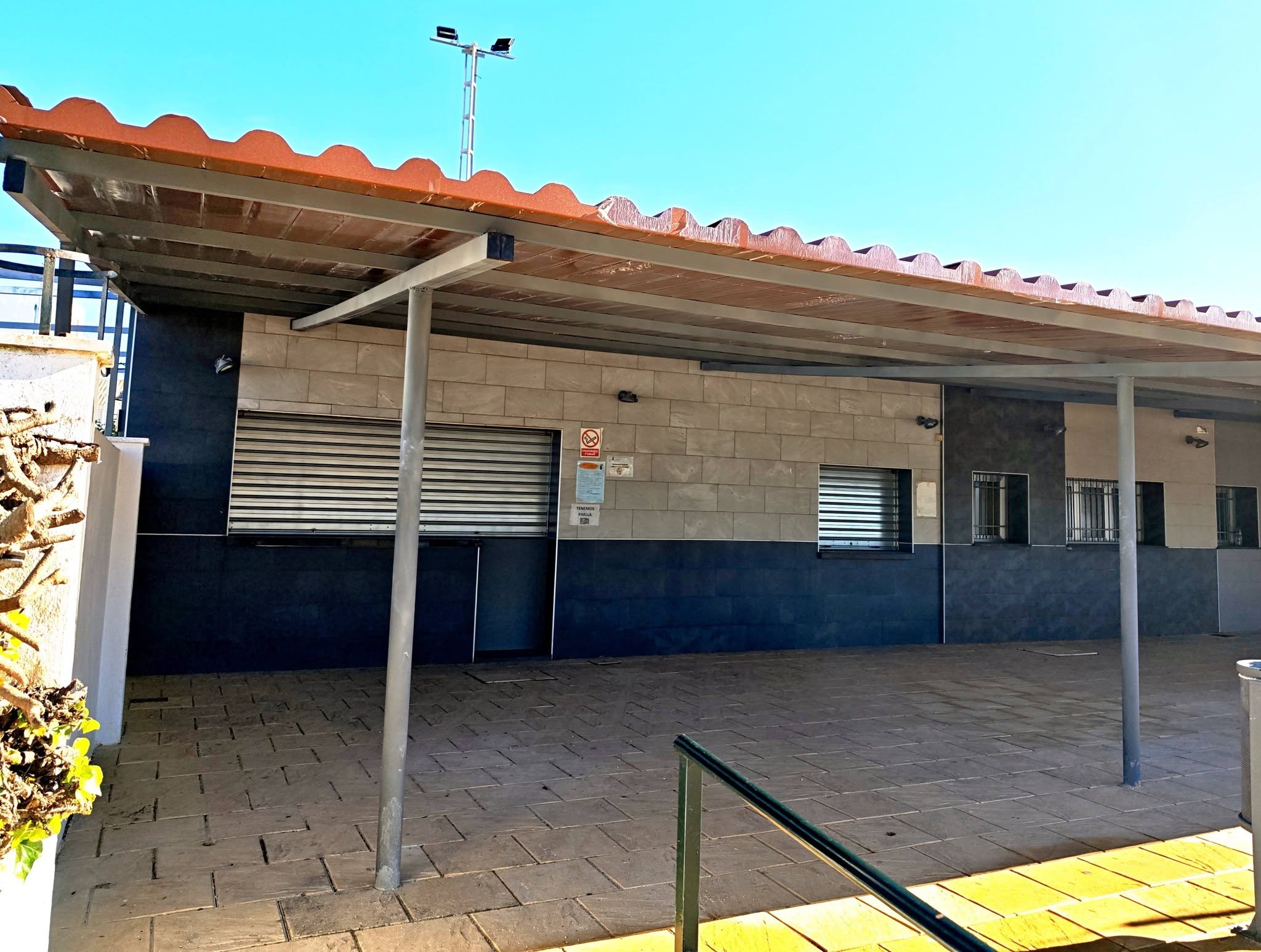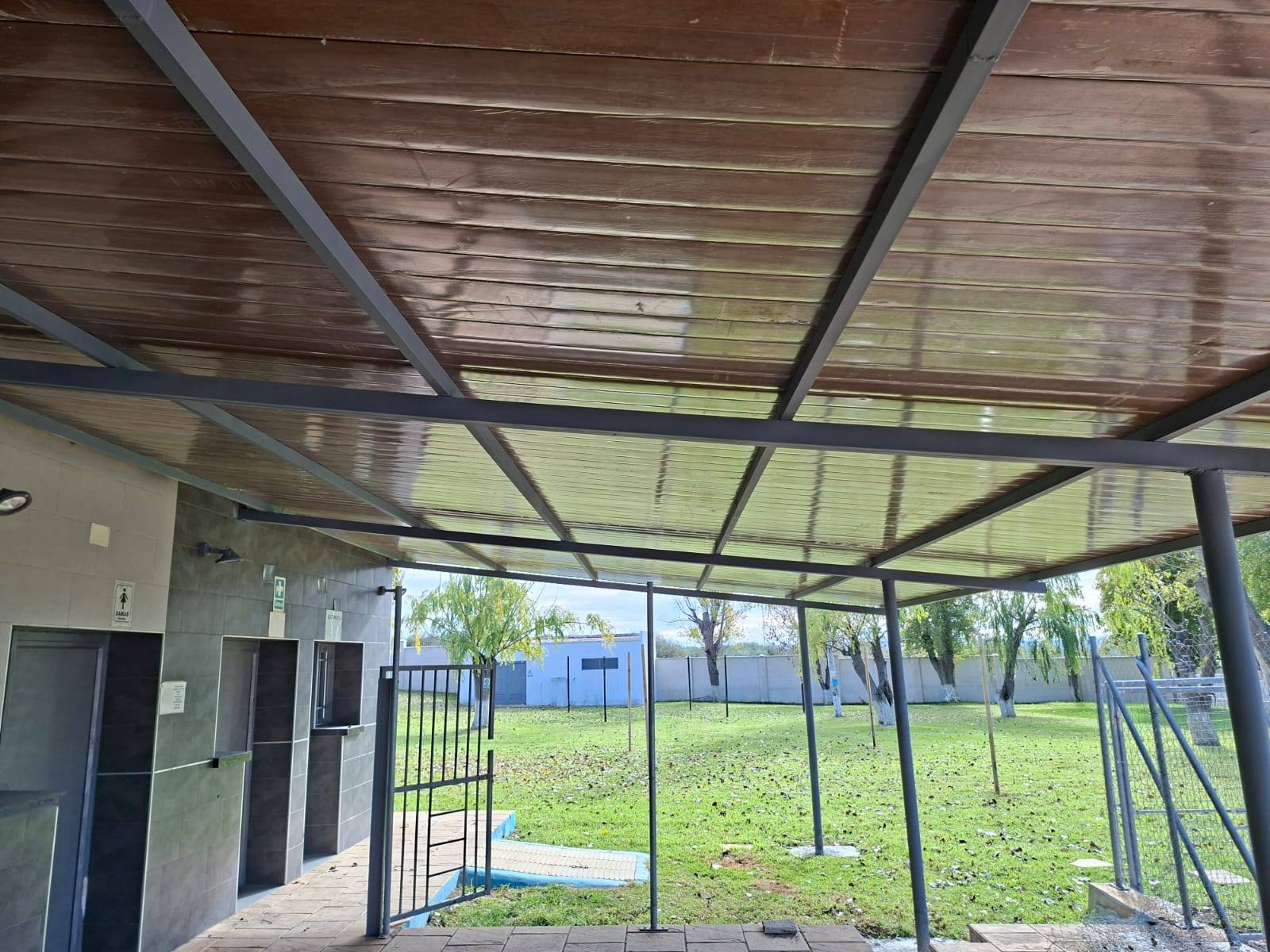 Finalizado el trabajo de reposición del techo sándwich para pérgola en la zona de vestuarios, servicios y terraza del bar de la piscina municipal.