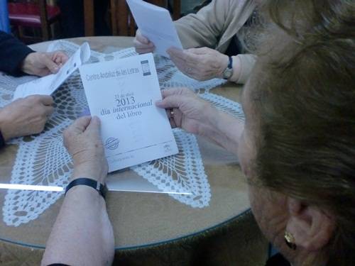 Asi mismo, se leyeron refranes, recogidos en el libro "Los 200 refranes más famosos del idioma castellano". Ambos libros pertenecen al fondo bibliográfico y se pueden sacar con el carnet de la biblioteca. Alicia Mallén, técnico del Área de Cultura repartió entre los asistentes solicitudes para obtener el carnet, además marcapáginas editados en años anteriores. El acto finalizó con la explicación del Libro de la Memoria a cargo de Antonio Rodríguez Vaquero, monitor del Taller de Refuerzo Cognitivo.
