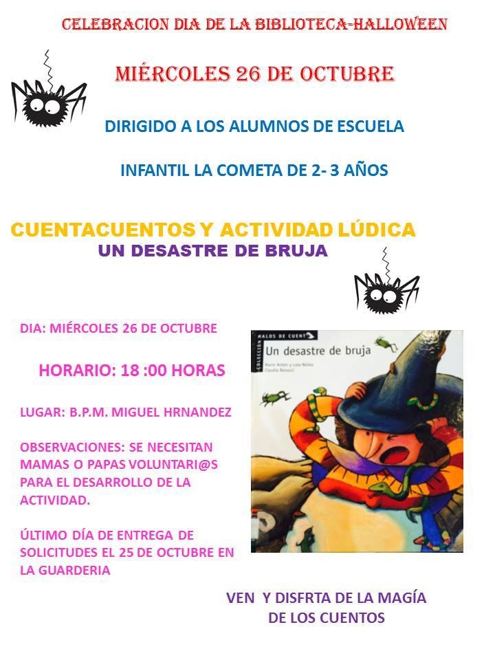 Cuenta cuentos un desastre de bruja. Fiesta de Halloween. Biblioteca PM Miguel Hernández