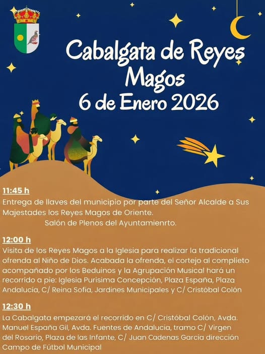 La Banda de Música será la encargada de anunciar la llegada de los Reyes Magos. A continuación, el Sr. Alcalde hará entrega de las llaves de la localidad a Sus Majestades. Acto seguido, se dirigirán a la Iglesia, donde los Beduinos les prepararán una majestuosa entrada y se dará paso al tradicional acto religioso de la Ofrenda al Niño Dios.