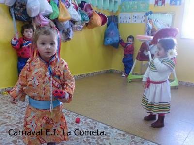 L@s pequeñ@s de la E.I. La Cometa han sido losprimeros en celebrar la fiesta de Carnaval. Las fiestas tuvieron lugar en el comedor de la escuela y a las cuales pudieron asistir familiares. Disfrazados con trajes típicos de distintos puntos del planeta: árabes, chin@s, irlandeses, mexican@s y rus@sbailaron e hicieron las delicias de los presentes.