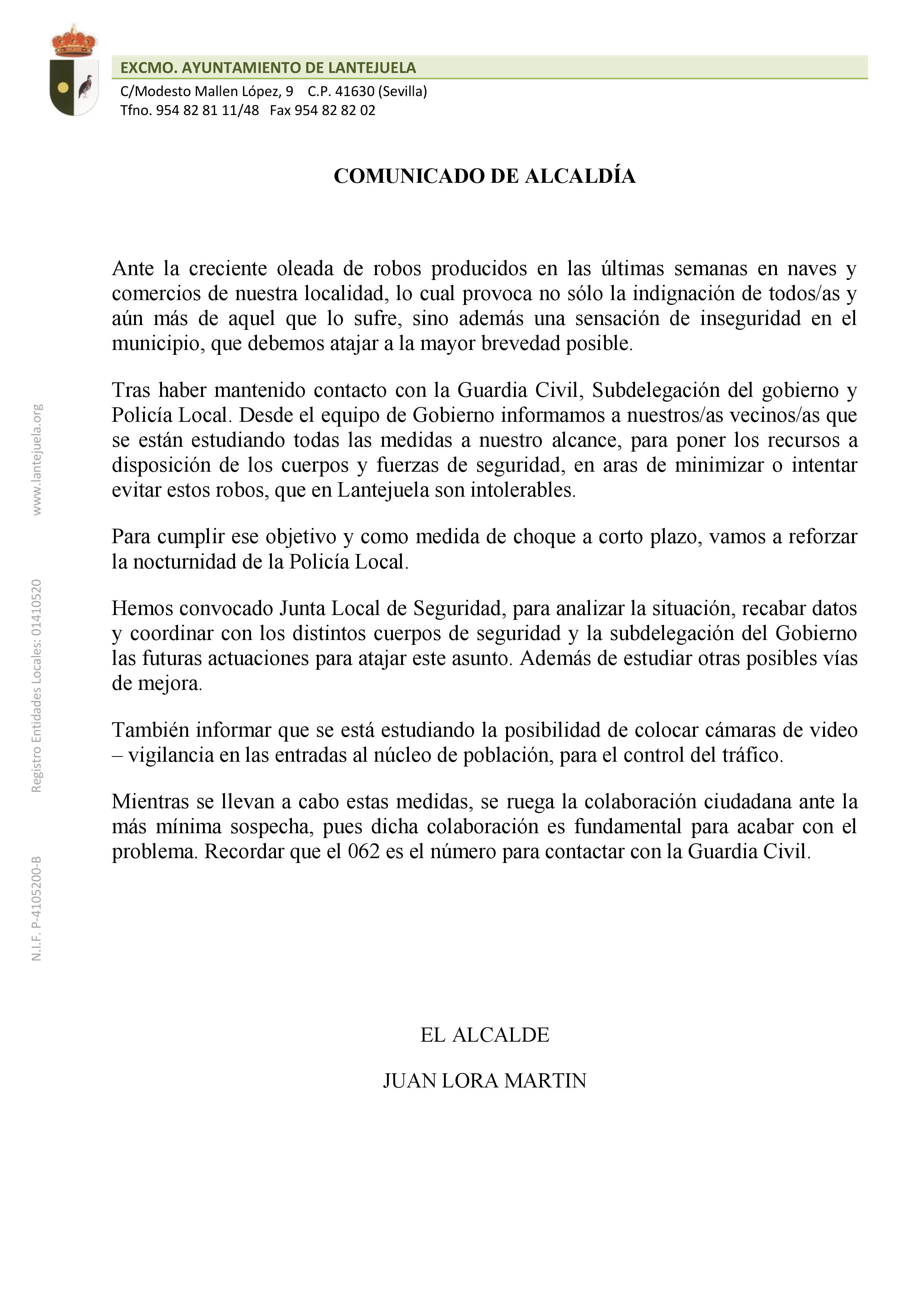 Comunicado de Alcaldía sobre la creciente oleada de robos producidos en las últimas semanas