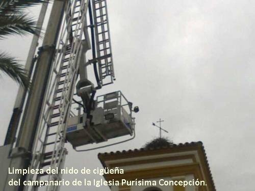 Limpieza del nido de cigüeña del campanario de la Iglesia Purísima Concepción.
