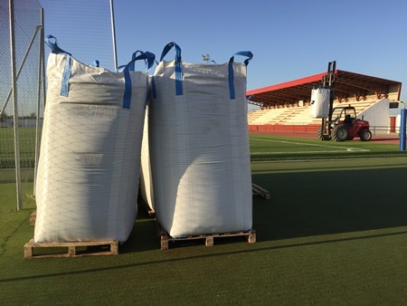 Descompactado y recebado de coco. Campo de fútbol de césped